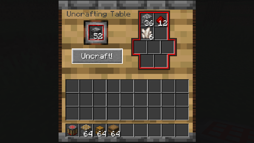 The mod respects recipe output counts. If a crafting recipe yields 4 items (e.g., Stairs or Torches), you must place exactly 4 of those items into the input slot to retrieve the ingredients. This prevents material duplication.